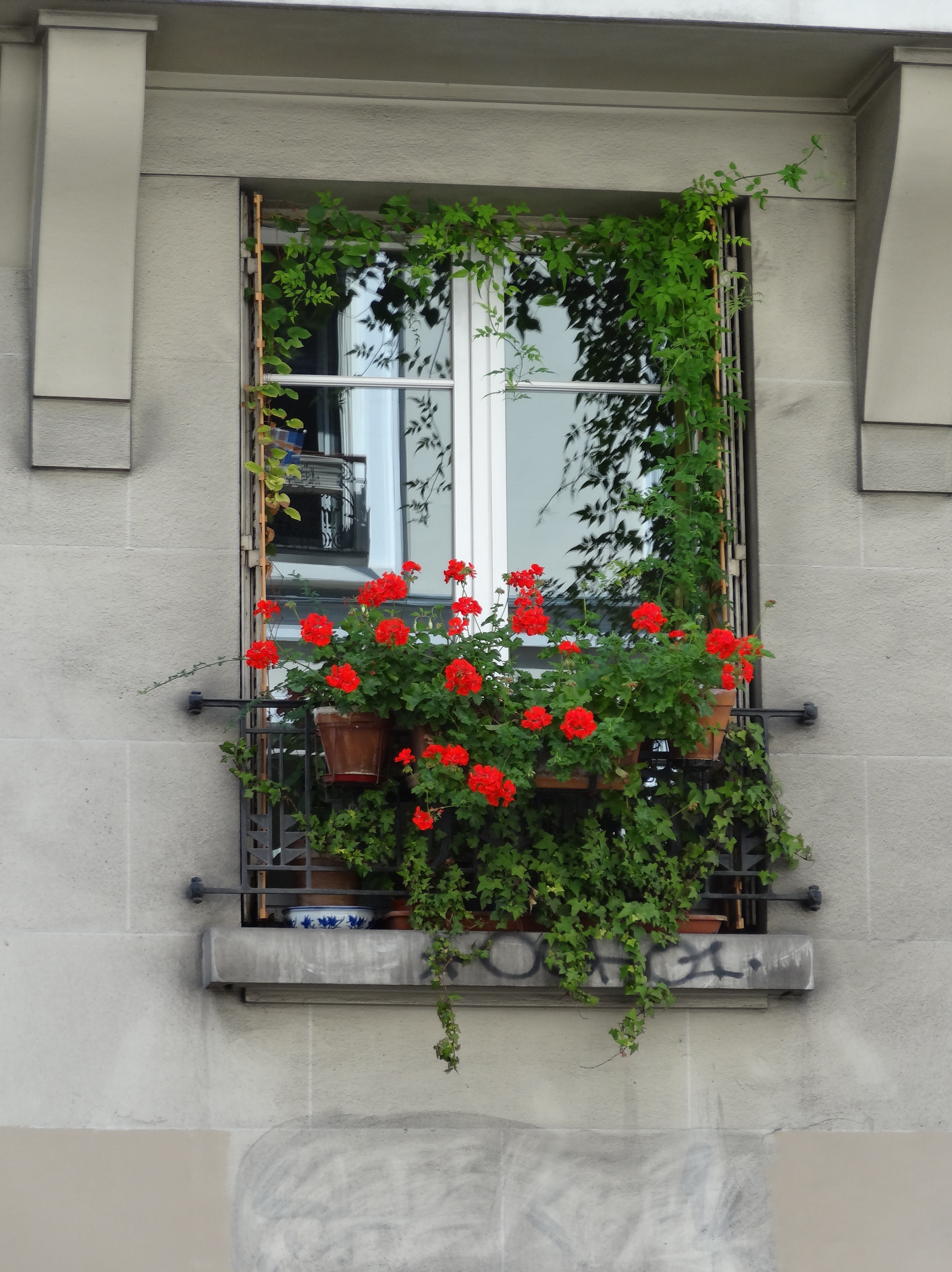 One of the many windows with geraniums on my walk.