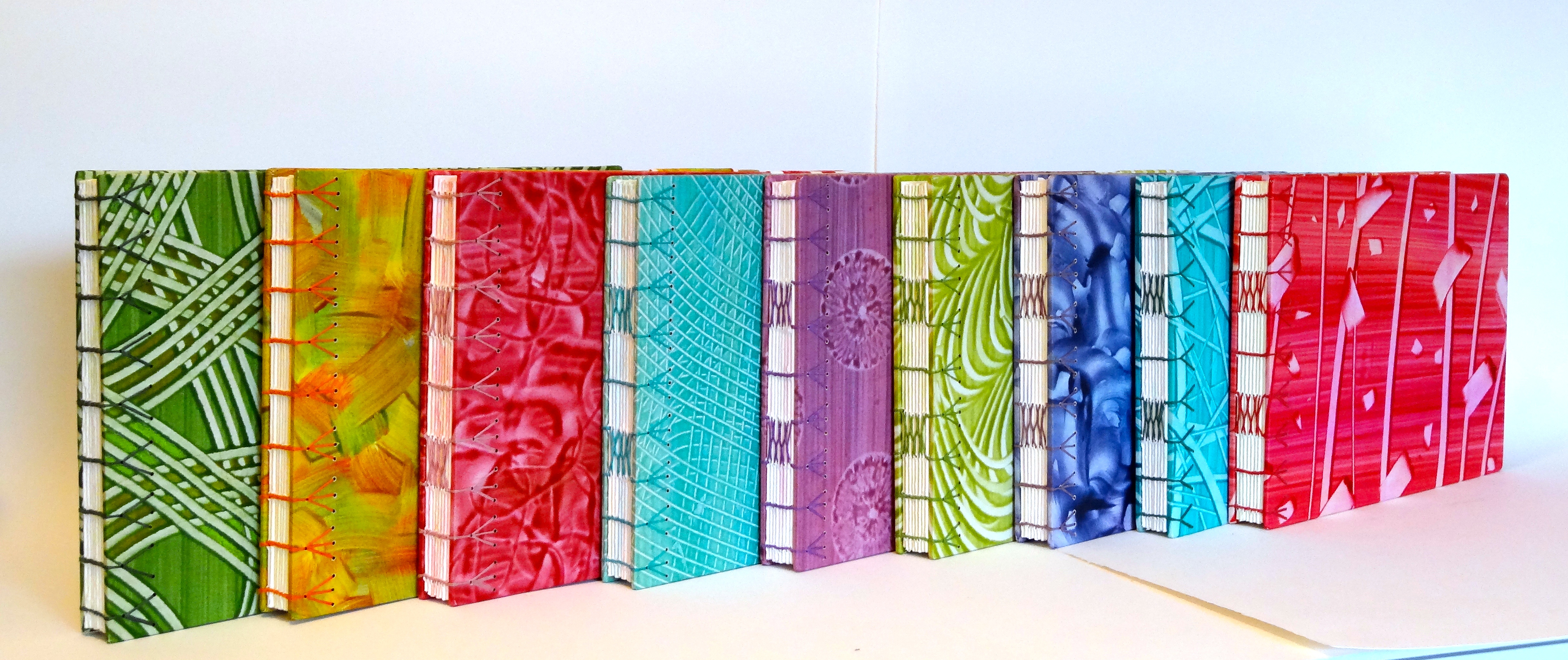 I love piles of books, especially piles of hand made ones. These journals are 7 1/4” x10 3/4” and the covers are made with my paste papers. We had a fun weekend in February making paste paper and paste book cloth, so I had a nice stash to choose from. The pages are Stonehenge 100% rag paper which I painted painted to coordinate with the book covers.