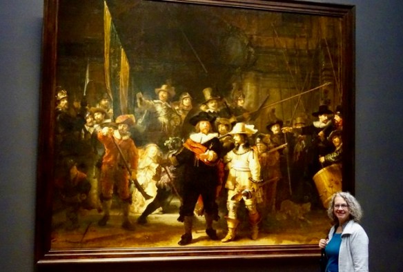 We spent more than six hours at the Rijk Museum today and although we didn’t see everything we did manage to see lots of fantastic art.  Image 2017-09-12 at 11.12 PMWe saw some of my favourites. It is always exciting to see, in person, paintings that I have admired in books for years…and I found some new favourites.  There were so many great Dutch artists that I have never seen before.This is the Gallery of Honour and at the far end is Rembrandt’s Night Watch.  Both Bob and I remember this painting from our last visit to the Rijk Museum over forty years ago.
