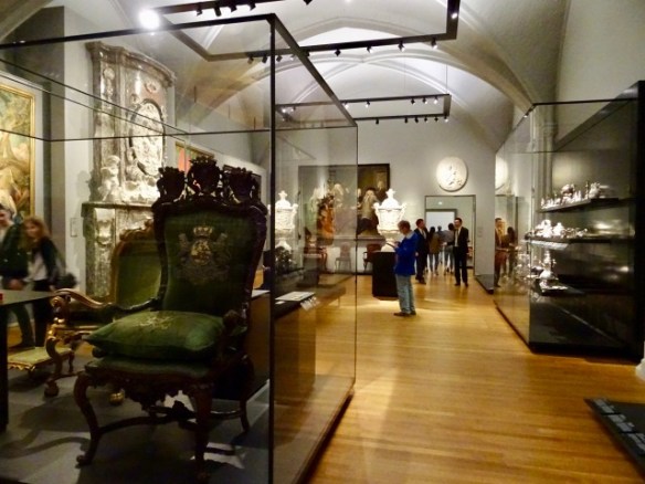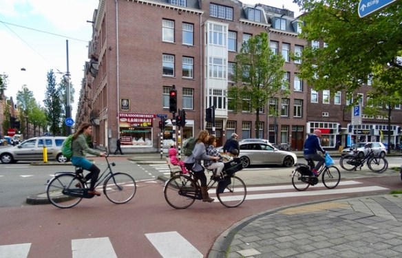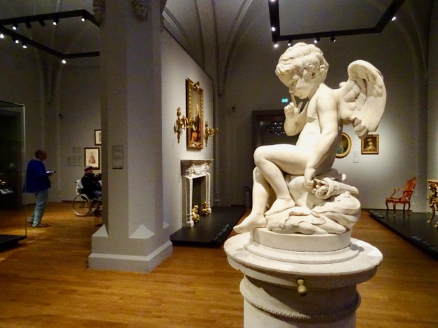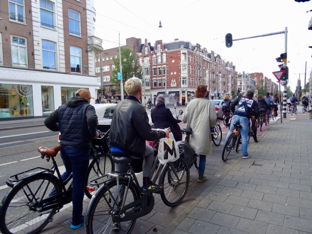 Any idea what all these doors are?  Check at the end of the post for the answer.The museum is a nice mix of paintings, sculptures, furniture and other historical objects. I always like to look in the museum shops although I seldom buy much.  This book was pretty amazing though. The white gloves at the top of the page give an idea of its size, and only a bit more than €6,000!On the way home we are surprised at how few cars are on the roads.  It is after 5:30 and everyone is coming home from work, but so many people ride bikes that there just aren’t that many cars on the roads.But there are so many cyclists, of all ages.  Notice that no one wears helmets. Parents often carry two children on their bikes, one in front and one behind. I also saw several children standing up on a carrying rack above the back tire, holding on to their parent’s shoulders!  I tried to get photo of this but they fly by so quickly I wasn’t able to get one.  Now that didn’t look at all safe to me.Here are some more parents with babies in front. No helmets anywhere to be seen. So different from home.  Even the motorcyclists here go bare headed.