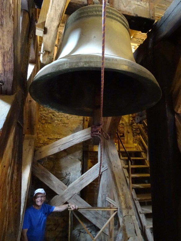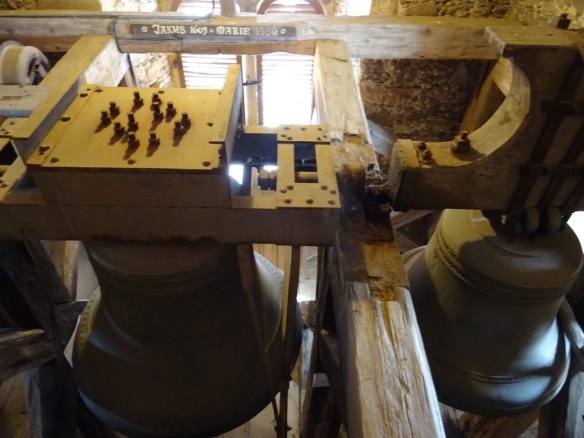 but soon we are climbing another 100 steps on old wooden timber steps up to the bells. This bell is named Marie and she was cast in 1550 and weighs 950 kg!