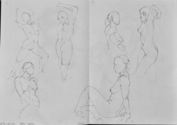 My drawing goes better today and we share our work upstairs in the bar afterwards. I met some lovely people from Australia, Korea, Montreal, England and Italy. The times for each pose are written on the pages.
