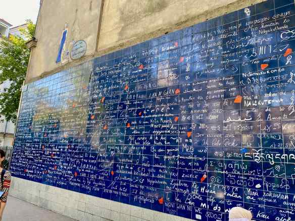 We have a rest and snack in a little park which contains ‘The Wall of Love’. This is is a 40-square-metre wall decorated with enamelled tiles containing 311declarations of love in 250 different languages. The wall includes the words ‘I love you’ in all major languages, but also in rarer ones like Navajo, Inuit, Bambara and Esperanto.