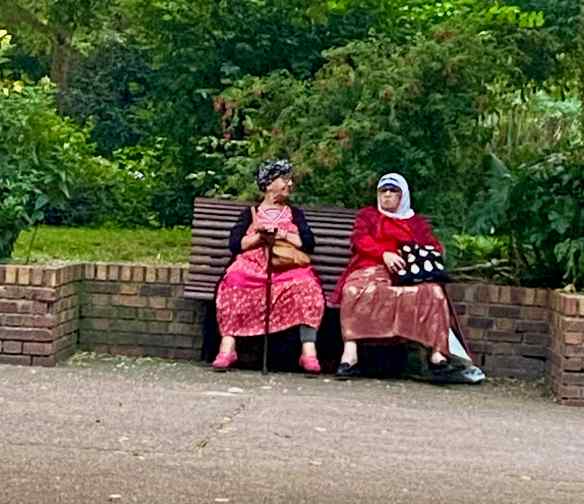 We find a little boulevard park to have tea and these sweet older ladies are sitting opposite us. I snuck a couple photos but they were a bit too far away so the resolution isn’t very good. I loved their outfits, that they were both sitting the same way with their canes between their knees, that their feet didn’t touch the ground…and they have such expressive faces.