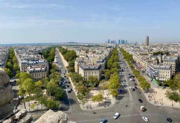 Here is a view with just three of the twelve roads that all converge at the Arc de Triomphe with the business district way off in the distance.