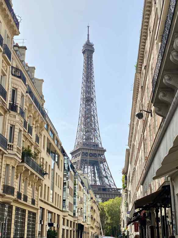 It is strange that we are not able to see the Eiffel Tower even though we know we are getting close, and then suddenly there it is in the sky between the buildings on one of the side streets. It looks close but it is deceiving. We still have several blocks to walk…