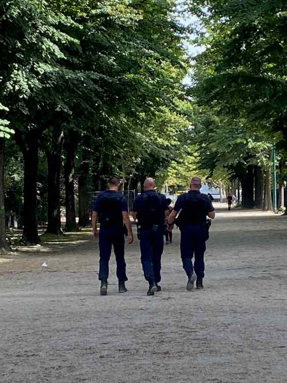 When I was here nine years ago, it was possible to walk around under the tower and there was a wonderful view across the river to the Jardins du Trocadero. You are now allowed to go to the top of the tower but we will wait to do that when we return to Paris and the weather is a bit cooler. There are quite a few heavily armed policemen walking about. The one in the middle is carrying a machine gun!