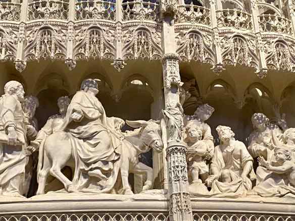 There is a lot of controversy about the restoration that is taking place.  The light areas in the photo below have been restored by covering everything with a sort of plaster, but it is not historically accurate. I think I prefer being able to see the old stones, they have a sense of age and history that the ‘restored’ areas do not.  In the photo of the altar you can see the faux marble pillars. The wall of the sanctuary is absolutely amazing.  The detail of the carving is incredible. The screen has forty niches along the ambulatory filled with statues telling the life of Christ.  I  particularly love the donkey.