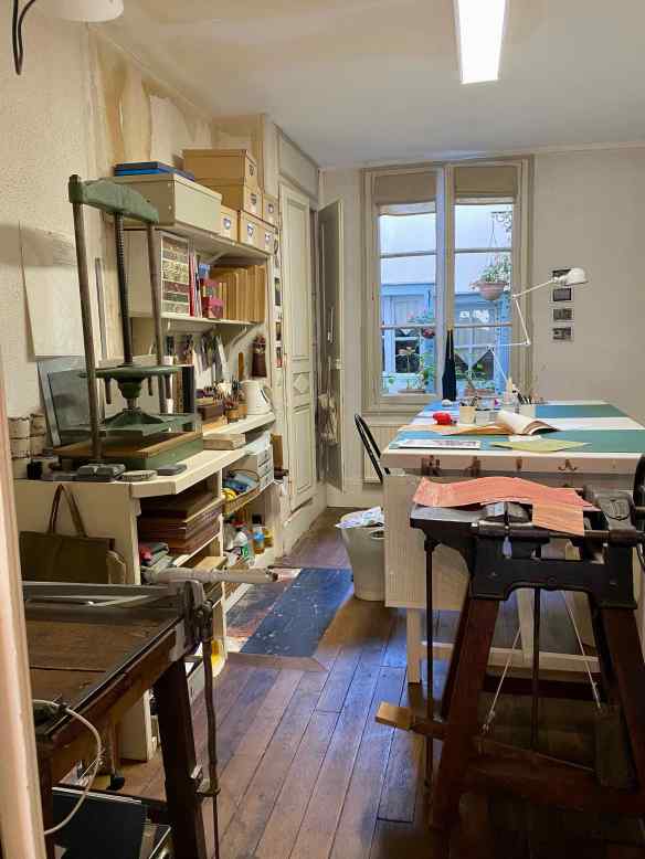 We chat in French and I manage fairly well. I tell her about the St. Albert Paper Arts Guild and show her some of my work, but somehow only managed to get this one photo. I was a bit nervous, trying to chat with her in French about bookbinding, but she was very gracious.  Her name is Sylvie Le Jannou but I was not able to find a website.  She did give me a card but it only has her name and email.
