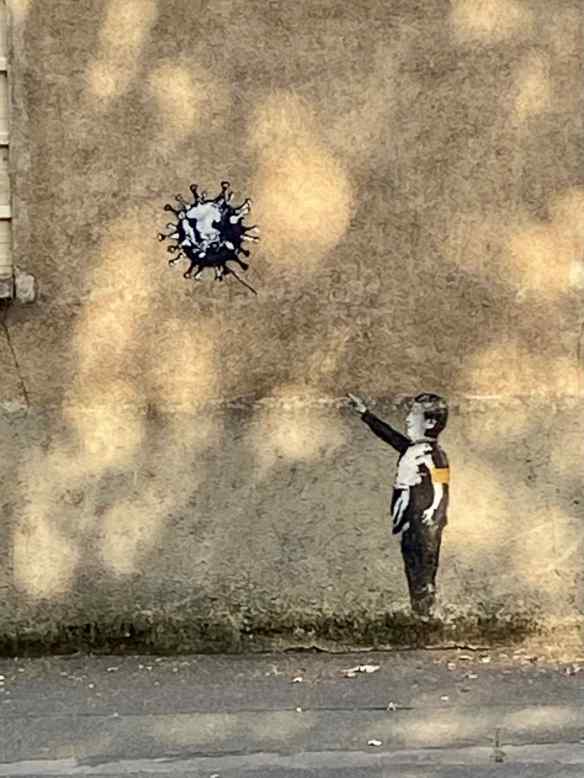 I thought that this cat in the windows should be a painting. As we leave I notice another example of street art. I saw another walking back to the car and I thought it looked like a Banksy, and this one could be too?  Turns out there is an exhibit of Banksy’s work here in Chartres. We missed that too.