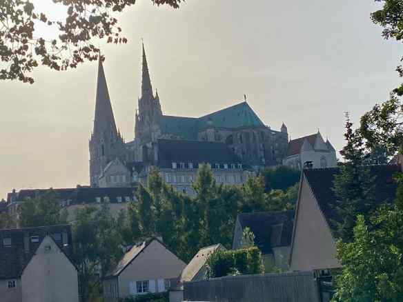 Our first view of the Chartres Cathedral, which is a UNESCO World Heritage site. “Partly built starting in 1145, and then reconstructed over a 26-year period after the fire of 1194, Chartres Cathedral marks the high point of French Gothic art. The vast nave, in pure ogival style, the porches adorned with fine sculptures from the middle of the 12th century, and the magnificent 12th- and 13th-century stained-glass windows, all in remarkable condition, combine to make it a masterpiece.” ~https://whc.unesco.org/en/list/81/