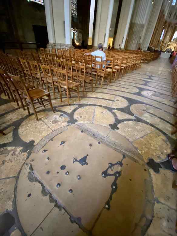 We missed the tour of the crypt and the opportunity to climb on the roof of this cathedral by an hour.  I guess we need to do a bit more research on times for tours and opening hours when we plan our day.  We almost missed seeing this labyrinth.  The chairs are moved once a week so that people can walk it.