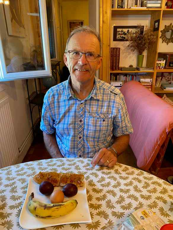 So, we have toast, plums and a banana for supper, and lucky Bob gets a hard boiled egg
