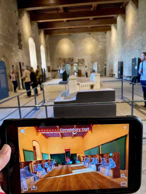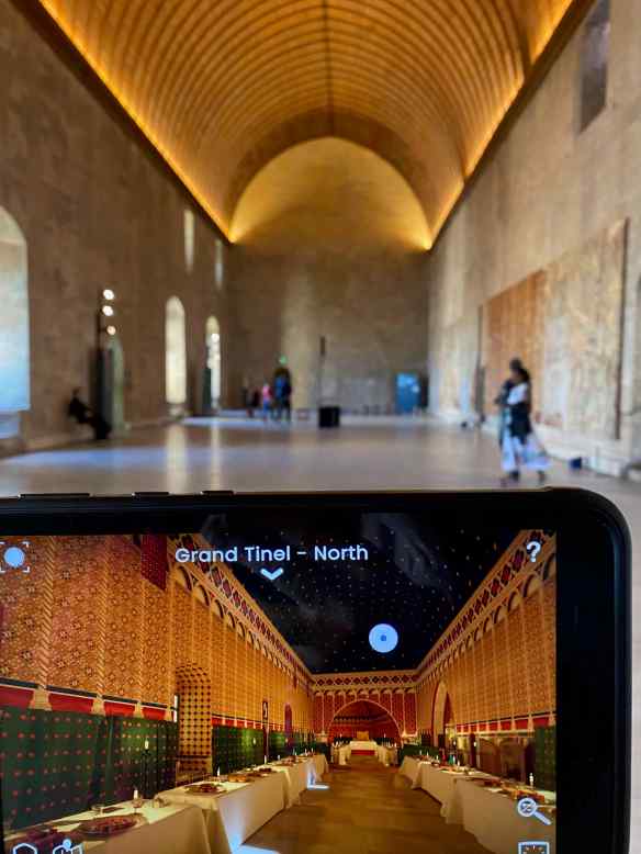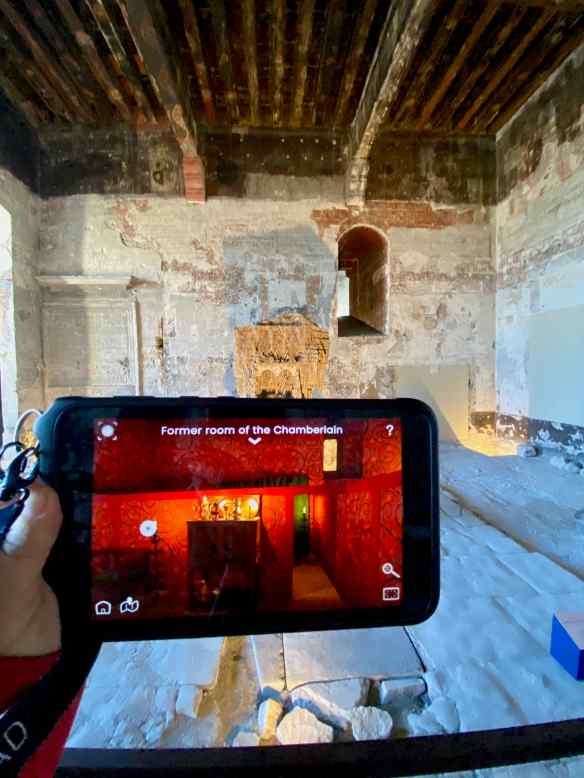 Our 12€ admission tickets includes the use of a Histopad. This device allows us to look in any direction, as well as up or down and the Histopad screen shows us what the room would have looked like in the 14th century.