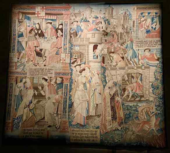 Next we walk for about half an hour, in light rain, to see some restored tapestries in the Musée Saint Remi. It is a large museum with many other exhibits besides the restored tapestries depicting the life of Saint Rémi. The museum is in a former abbey and has a magnificent central staircase.