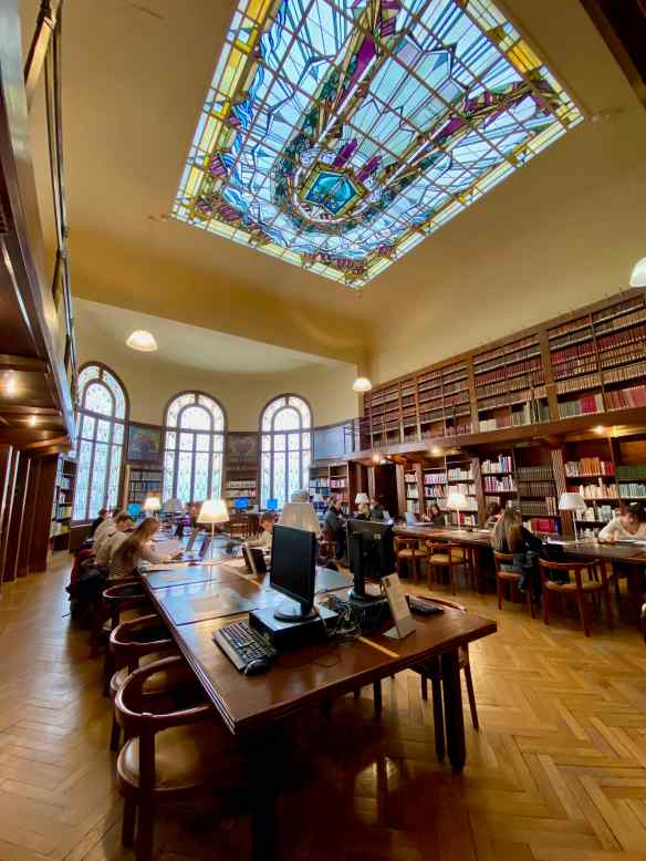 Next stop is the Carnegie Library. The Carnegie Library of Reims is a public library built with money donated by businessman and philanthropist Andrew Carnegie to the city of Reims after World War I. It is built in an Art Nouveau style and is very beautiful.