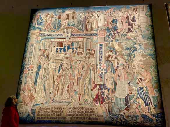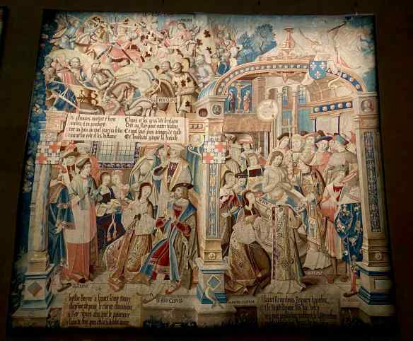 Next we walk for about half an hour, in light rain, to see some restored tapestries in the Musée Saint Remi. It is a large museum with many other exhibits besides the restored tapestries depicting the life of Saint Rémi. The museum is in a former abbey and has a magnificent central staircase.