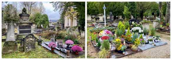 On our way to Maison Mumms we pass the Cimetière Du Nord which opened in 1787.  November 1st is All Saints Day in France,  this is the day that families visit cemeteries and place pots of chrysanthemums on the graves.  We walk through a little bit of the cemetery to see if the flowers are still there and they are.  I wish we had more time to explore but we  don’t want to be late for our tour of Maison Mumm.