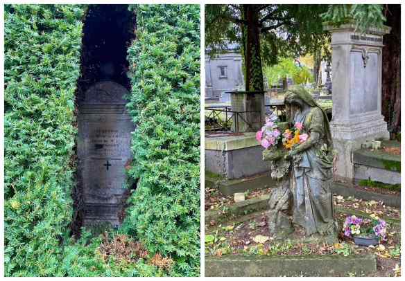 Bob noticed this evergreen that had been trimmed back to reveal a tombstone from 1852 and I liked the statue holding flowers.