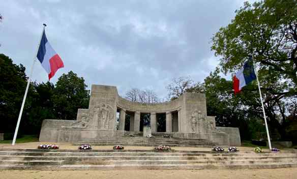 There is a war memorial near the cemetery with bouquets of red, white and blue flowers…the colours of the French flag.