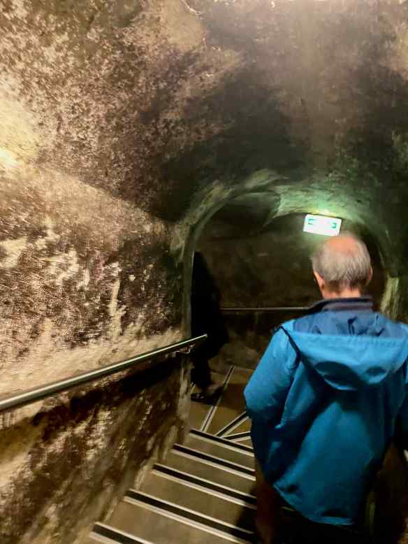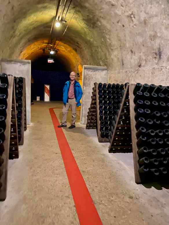 We descend 40 meters to the galleries where the champagne is stored to mature.  Notice the black mold!  I am shocked to see that there is black mold everywhere.  Our guide explains that the people who work in this area get ‘danger pay’.  She says there is no way to control the mold growth!