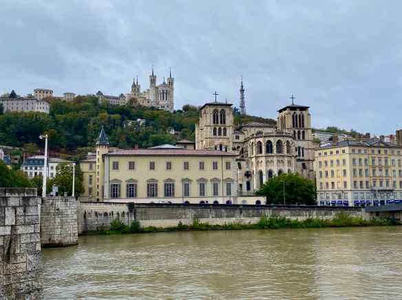 It is still not very nice outside but tomorrow is supposed to be even worse, so we take a bus and the metro to visit downtown Lyon.  Public transportation in Europe is so easy to use and much better than driving and trying to find a place to park.  We walk across the bridge over the Rhône River towards Notre Dame de Fourvière, the church high on the hill in this photo.
