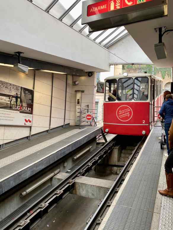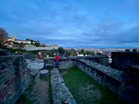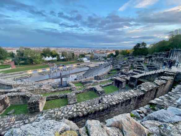 It is a short walk to the Lugdunum site.  Lugdunum was the capital of Roman Gaul in the 1st century.  During the Middle Ages it gradually became known as Lyon. These ruins are from the oldest theater in Roman Gaul and it is also one of the largest (108 m in diameter). we are pleasantly surprised that there is no fee to visit these ruins. It is a long ways down, and no railings. This theatre held 10,000 spectators.