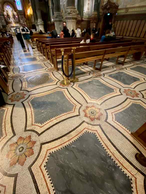 The floor is made of many small mosaic tiles interspersed with marble tiles.