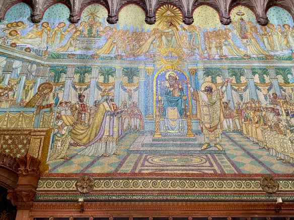 A view of the altar and ceiling.  Gilt, marble, stained glass and coloured mosaics cover almost every surface.