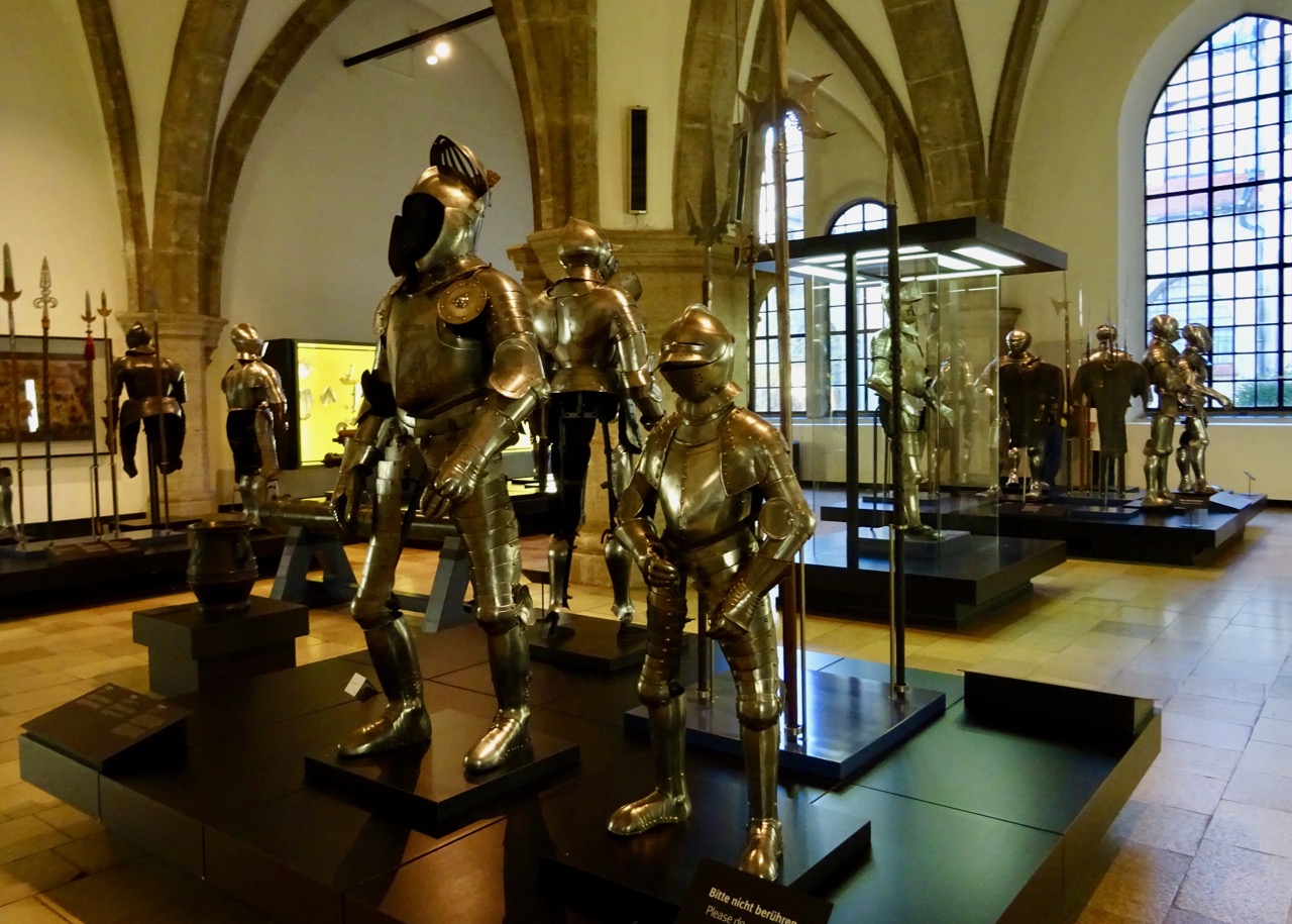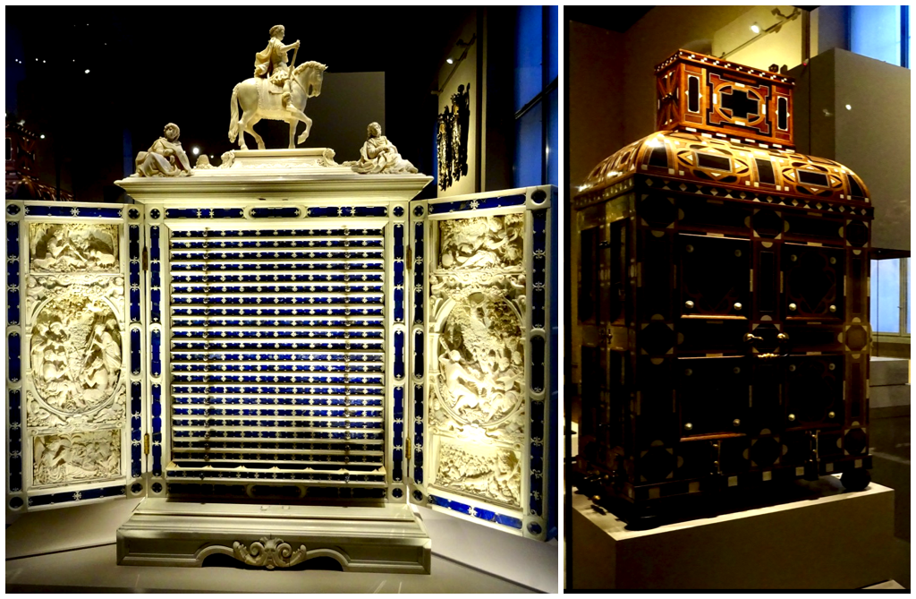 The next room is filled with amazing cabinets. I love boxes and cabinets with lots of drawers, and I have never seen anything like these. The coin cabinet of Maximillian I was made for his collection of gold coins. Each of the rows is a shallow drawer with fitted spaces for the coins. It is made of ivory, lapis lazuli, silver and enamel, so of course it must have its own storage case! The case on the right hinges open in the middle so the cabinet can be inserted for safe keeping.