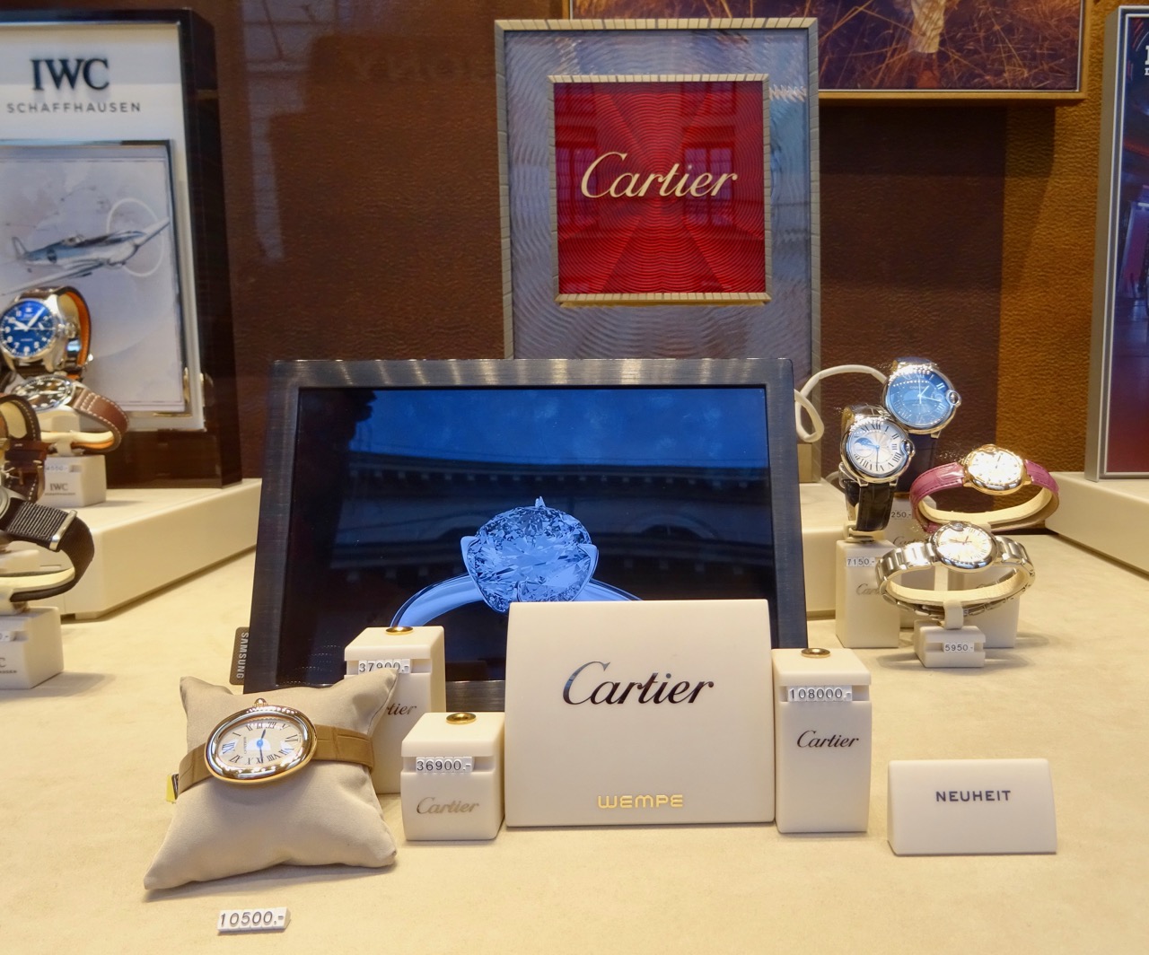 The stores are closed so they only leave the ‘cheaper’ watches in the windows. Notice the empty stands for the more expensive ones.