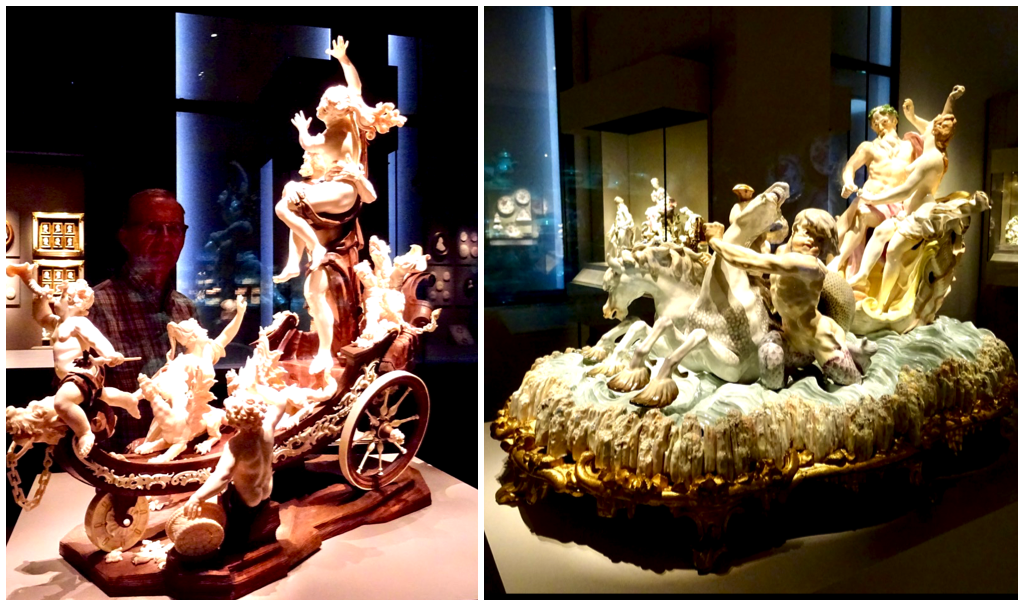 The Rape of Proserpina on the left is carved in ivory, and the porcelain centrepiece on the right depicts Neptune being drawn by seahorse and tritons. They were both completed in the mid 1700’s.