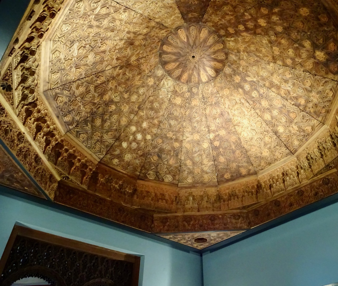 This intricately carved ceiling is from the Alhambra in Spain. We saw other ceilings like this when we visited there a few years ago.