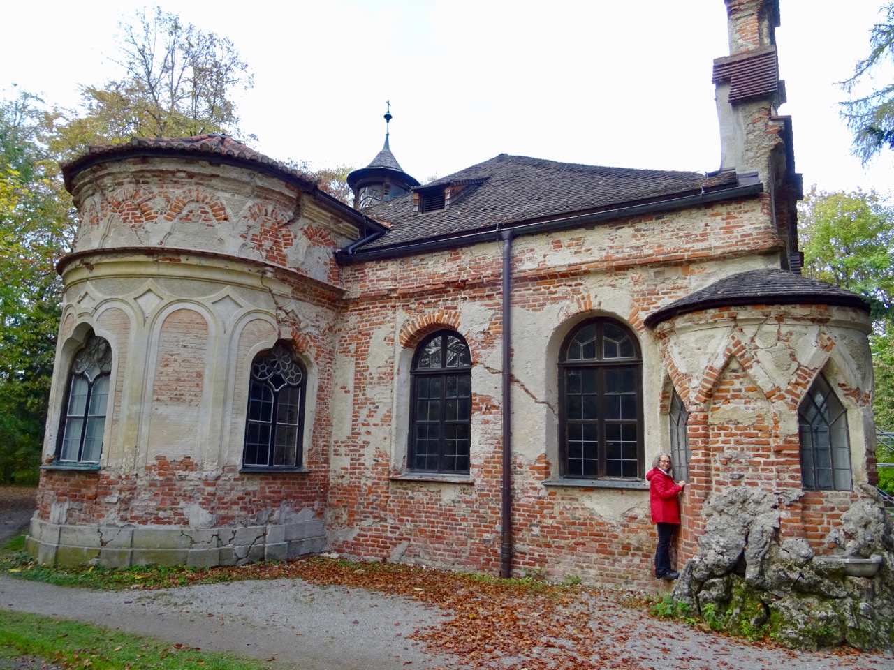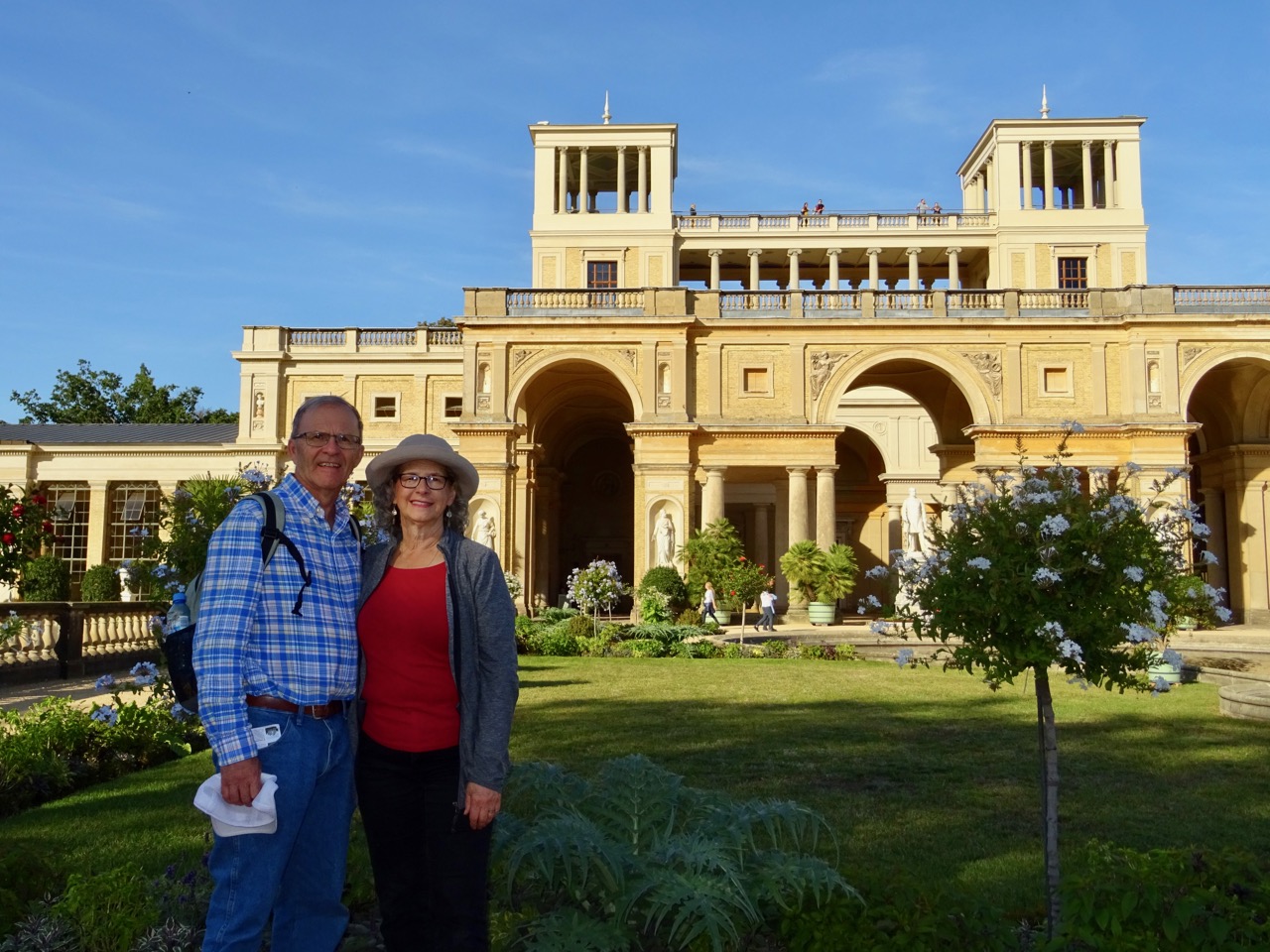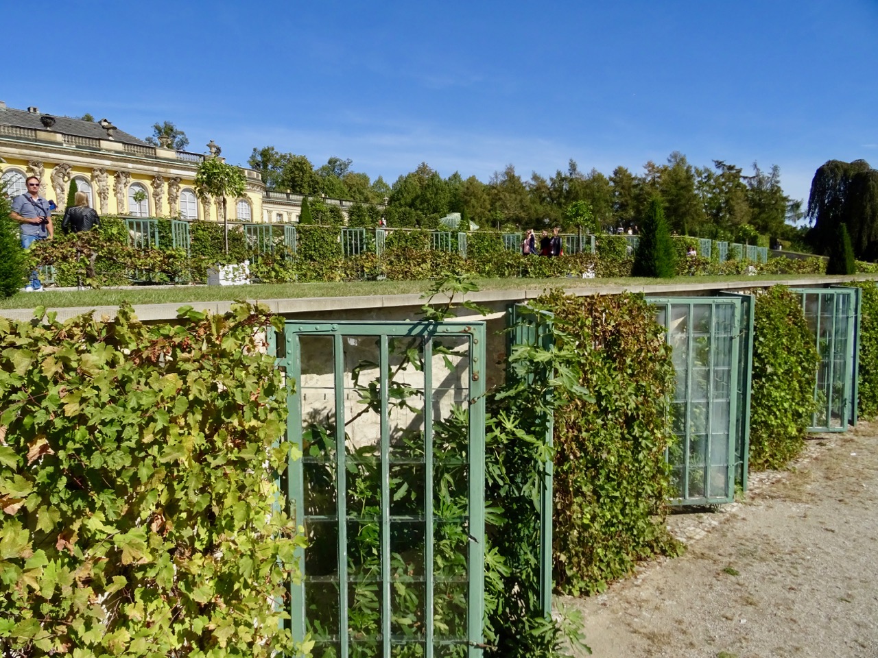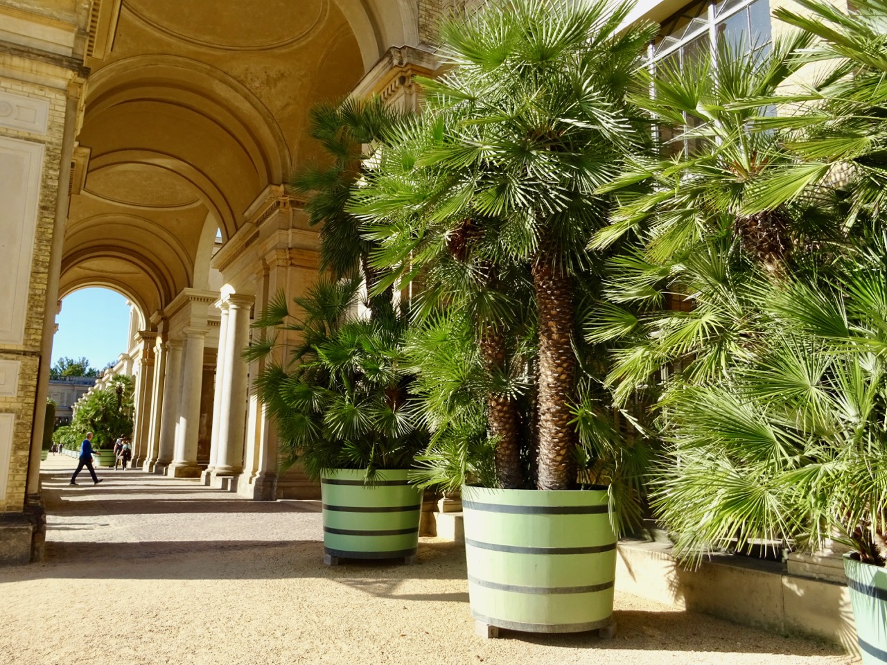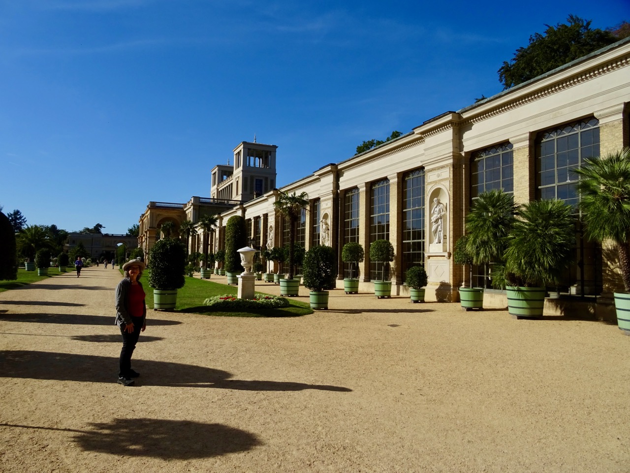 Wow! We have never seen an orangerie this large. It is enormous! This photo shows one wing and the entrance behind me. There is another wing just as long on the other side of that entrance. This Orangerie was built by Frederich William IV in 1851-1864. It is 300 meters long.
