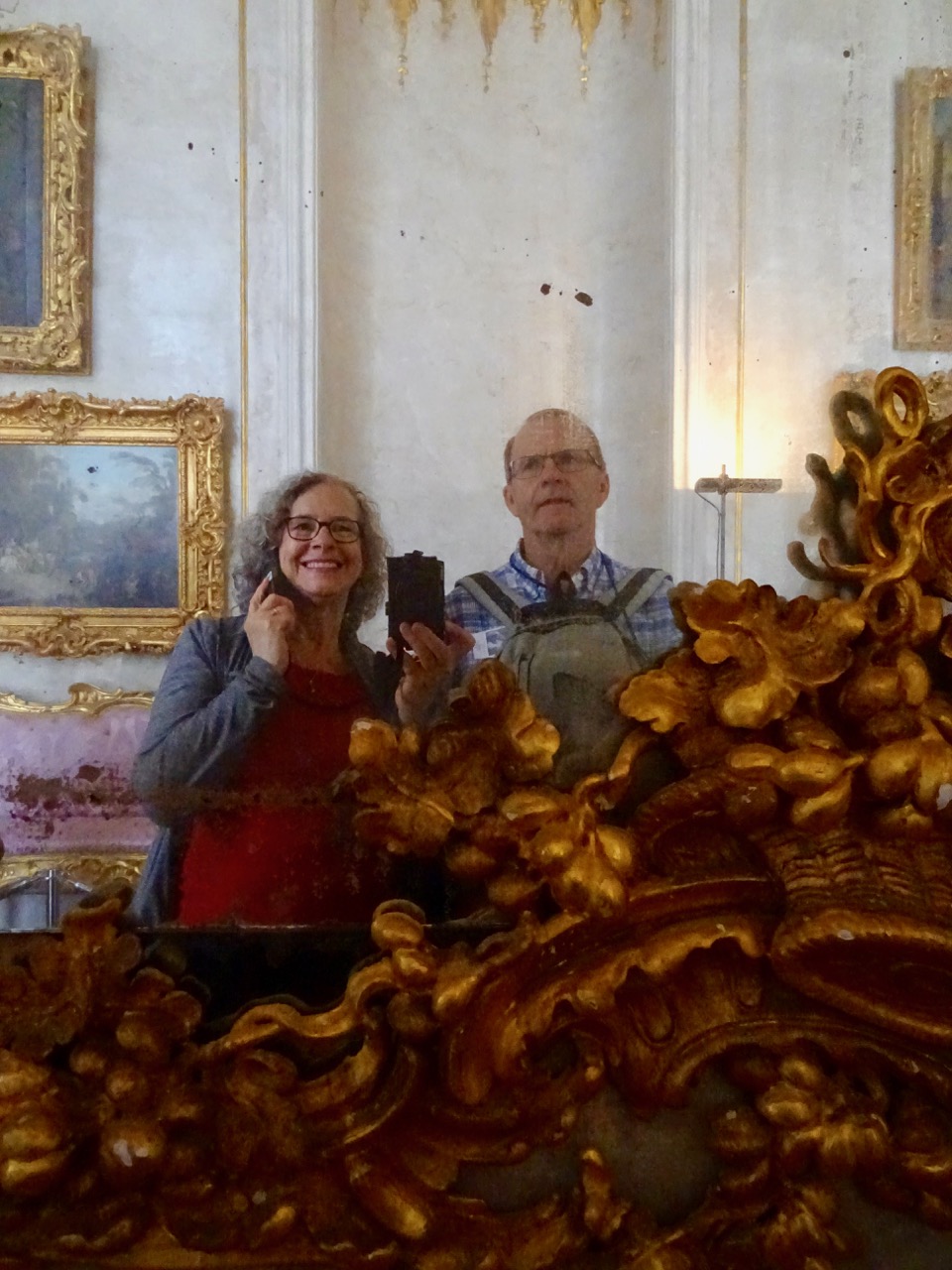 And another selfie reflection in a very ornate mirror. Notice our big slippers!