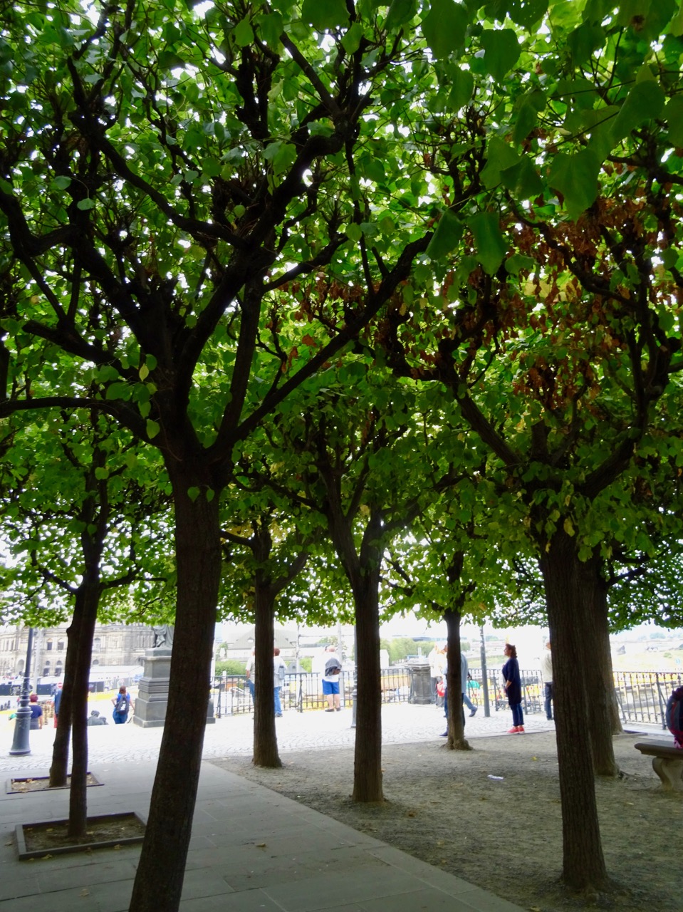 We walk along the Elbe River, looking for a bathroom, or WC as they are called here. They are few and far between! We do find this lovely terrace where the trees form a canopy over the whole area.
