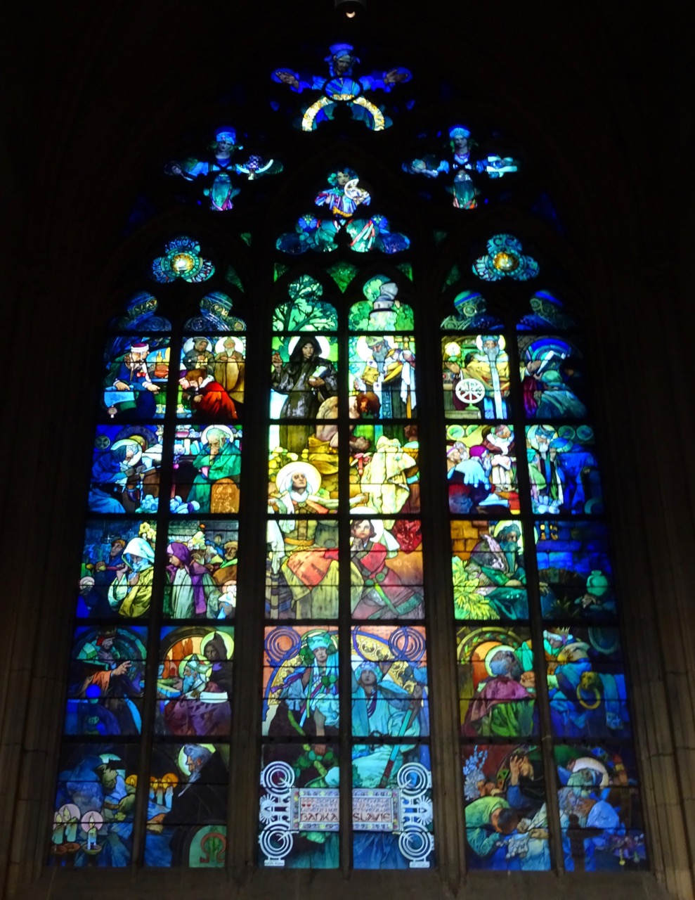 St. Vitus is portrayed with a rooster by his side, because he was boiled to death in a pot with a rooster! These saints all seem to have had horrible tortuous deaths. St. Vitus never actually even visited this cathedral, but a relic, or pieces of his body, was brought here and the Cathedral was built to honour him.