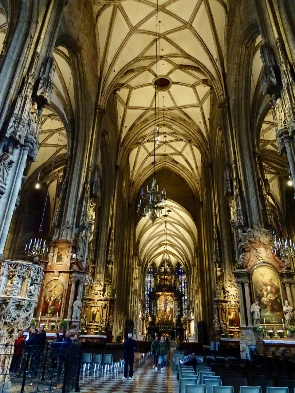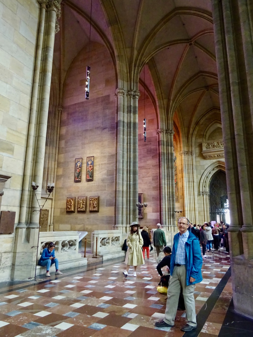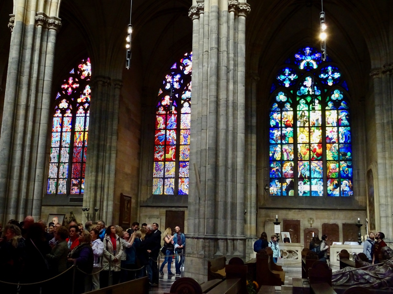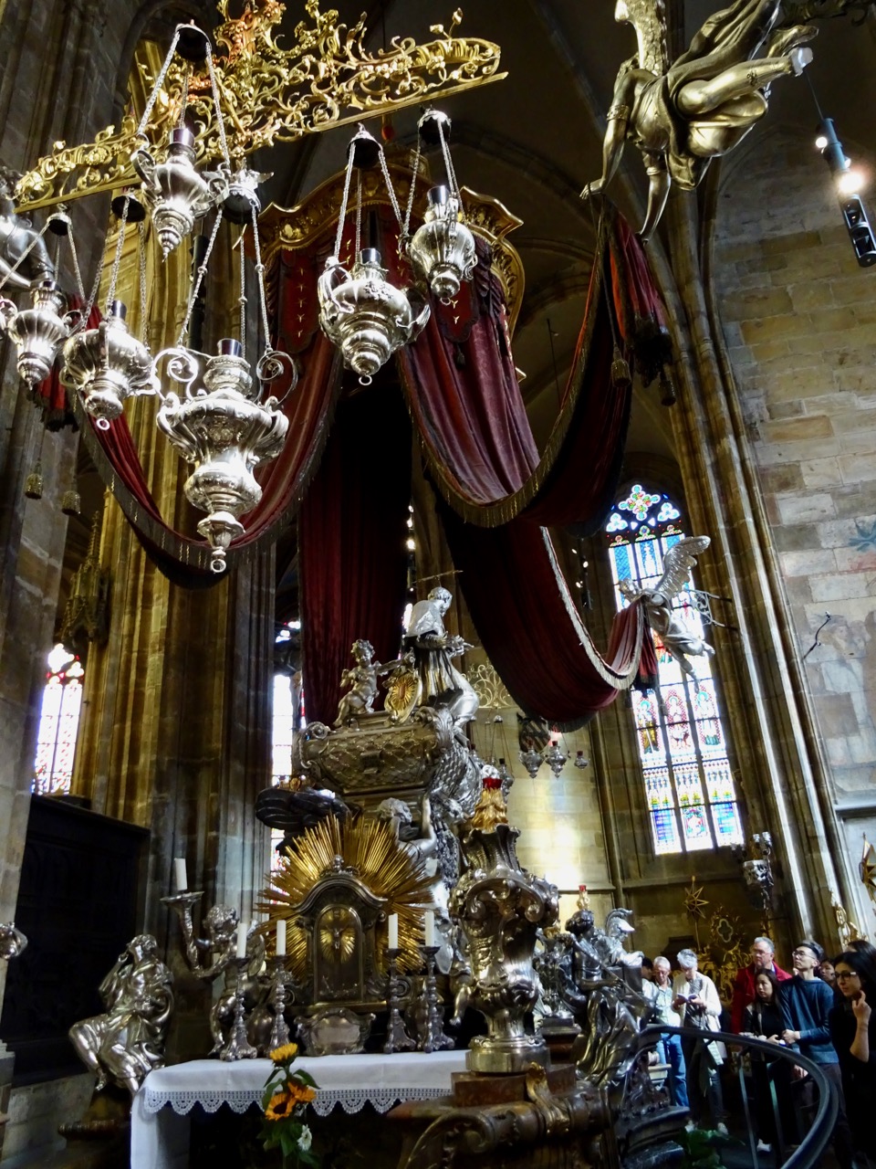 St John of Nepomuk’s tomb is an elaborate baroque silver tomb with angels supporting a draped canopy. It is said to contain two tonnes of silver. St. John is the patron saint of the Czechs. There are so many people visiting this cathedral that I had to take this photo looking back towards the tomb to get a decent shot.