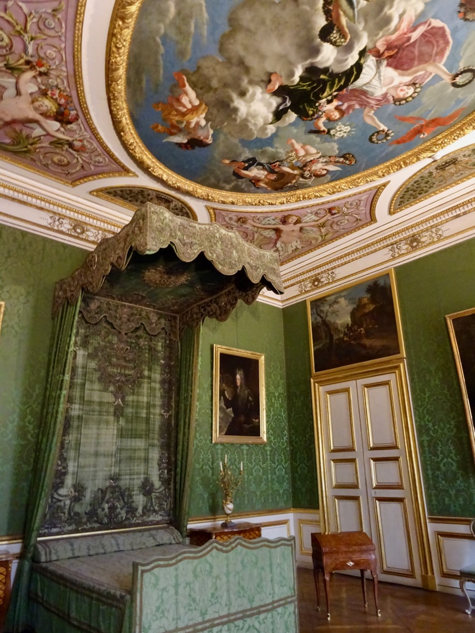 Frederick loved nature and the palace was decorated with botanical themes. The palace was his refuge and he lived there from April to October. Sanssouci is from the French “sans soucci”, which means “without worry”. Frederick was married but lived separately from his wife. He only married because his father threatened him with imprisonment if he did not comply. His father was very strict and made his Frederick’s life miserable. He had a miserable childhood as his father thought him effeminate and tried to change him. Frederick was gay and surrounded himself with male friends and companions at Sanssouci. Women were not welcome there. The yellow room below has raised carved decorations, and a sleeping nook for the bed, as did all the bedrooms. Notice the spiders on the ceiling decoration.