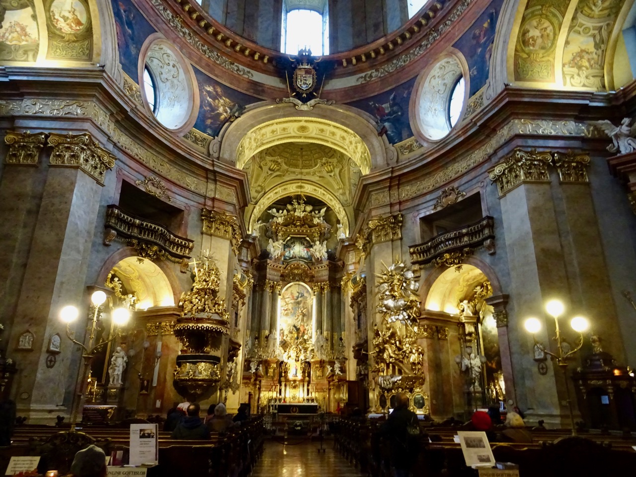 We had a huge surprise when we entered St. Charles Church. Two enormous floating mirrored balls that reflected the church…
