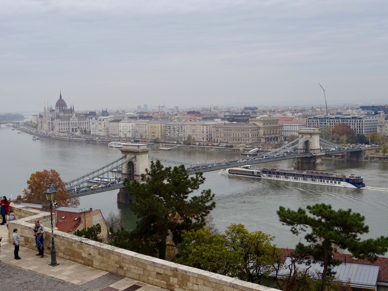 We see a large river cruise ship o the Danube.