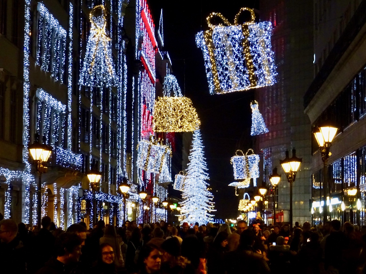 One last walk down the decorated street towards the Christmas Market. There are so many more people out on the streets tonight.