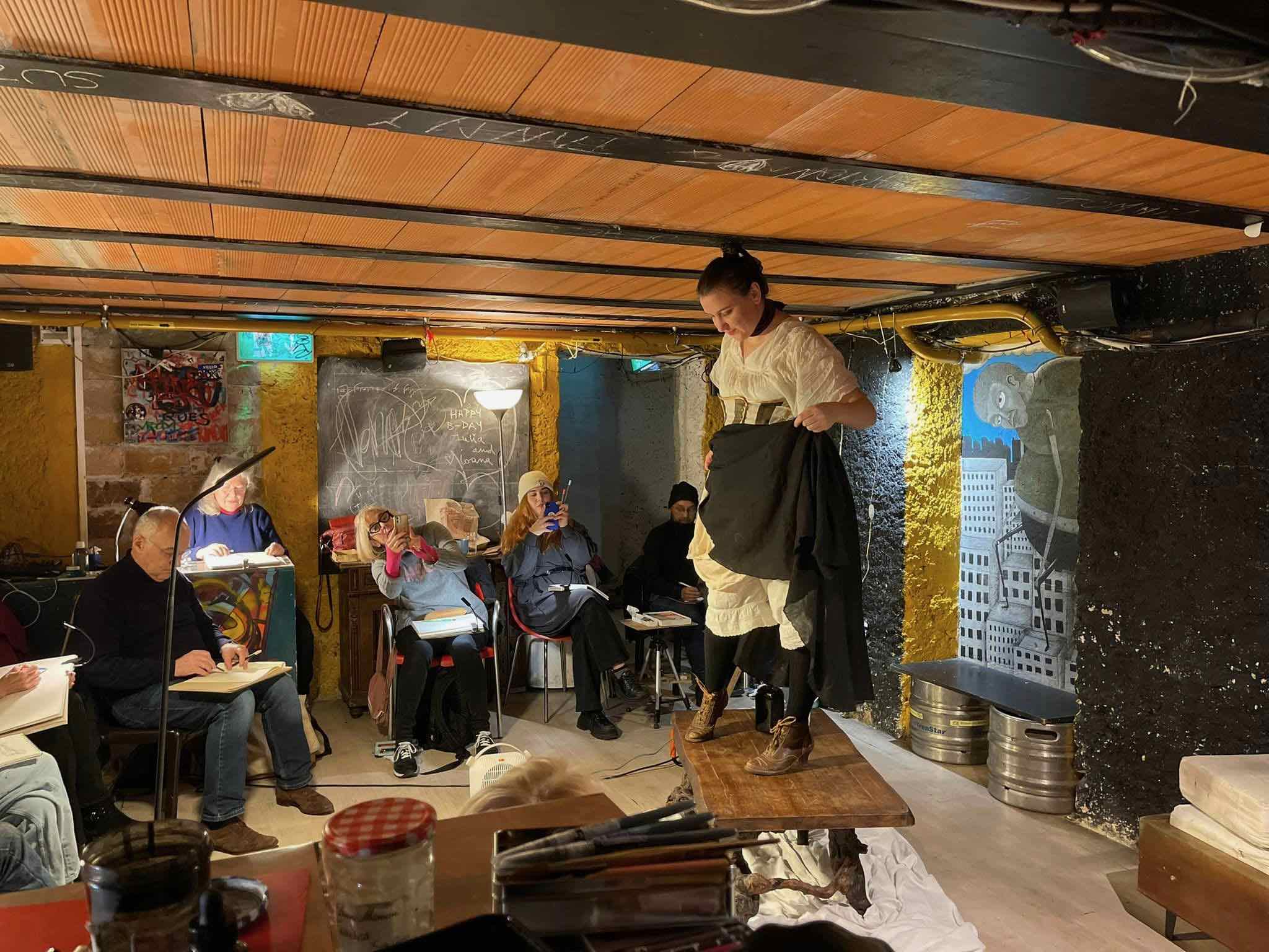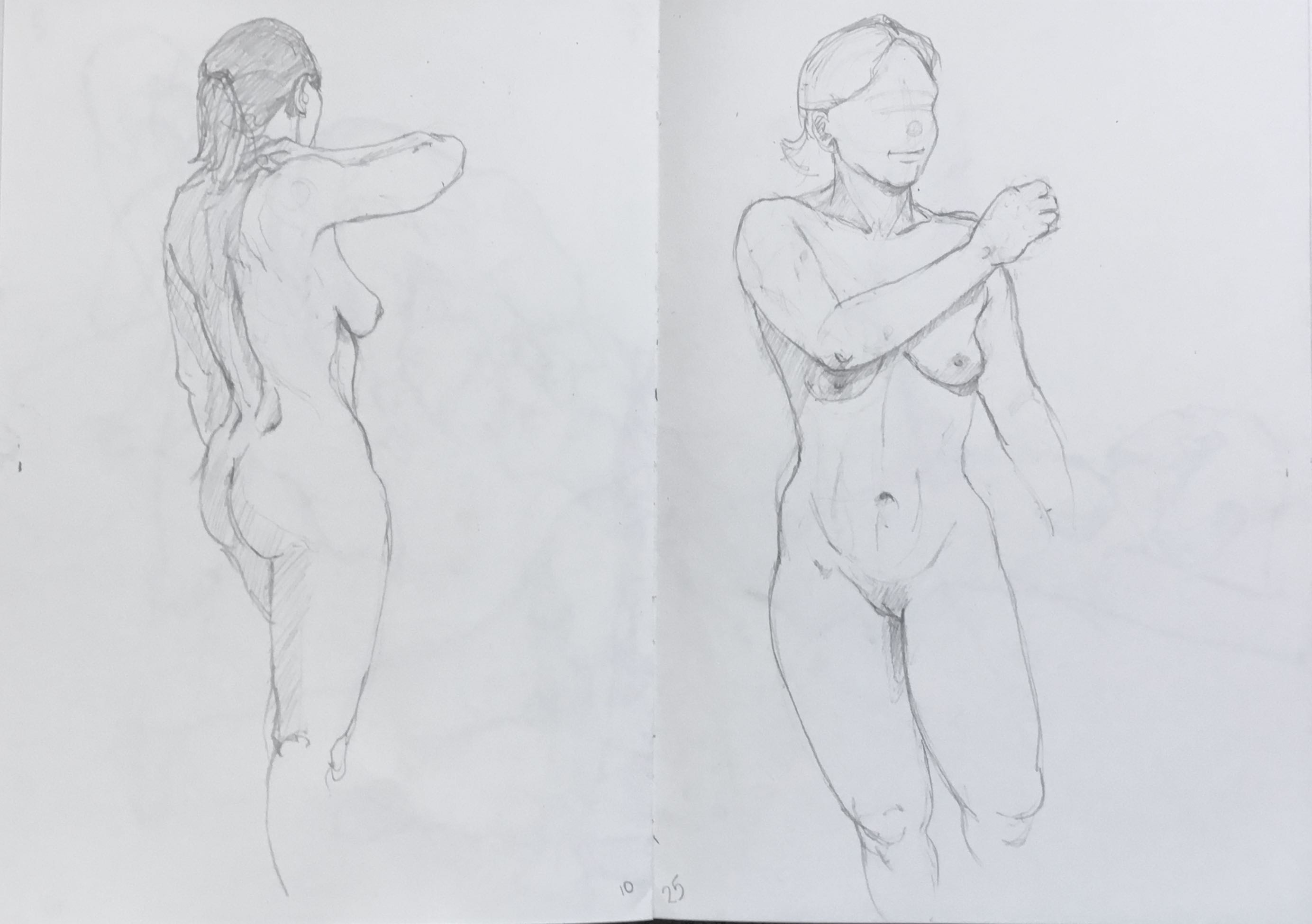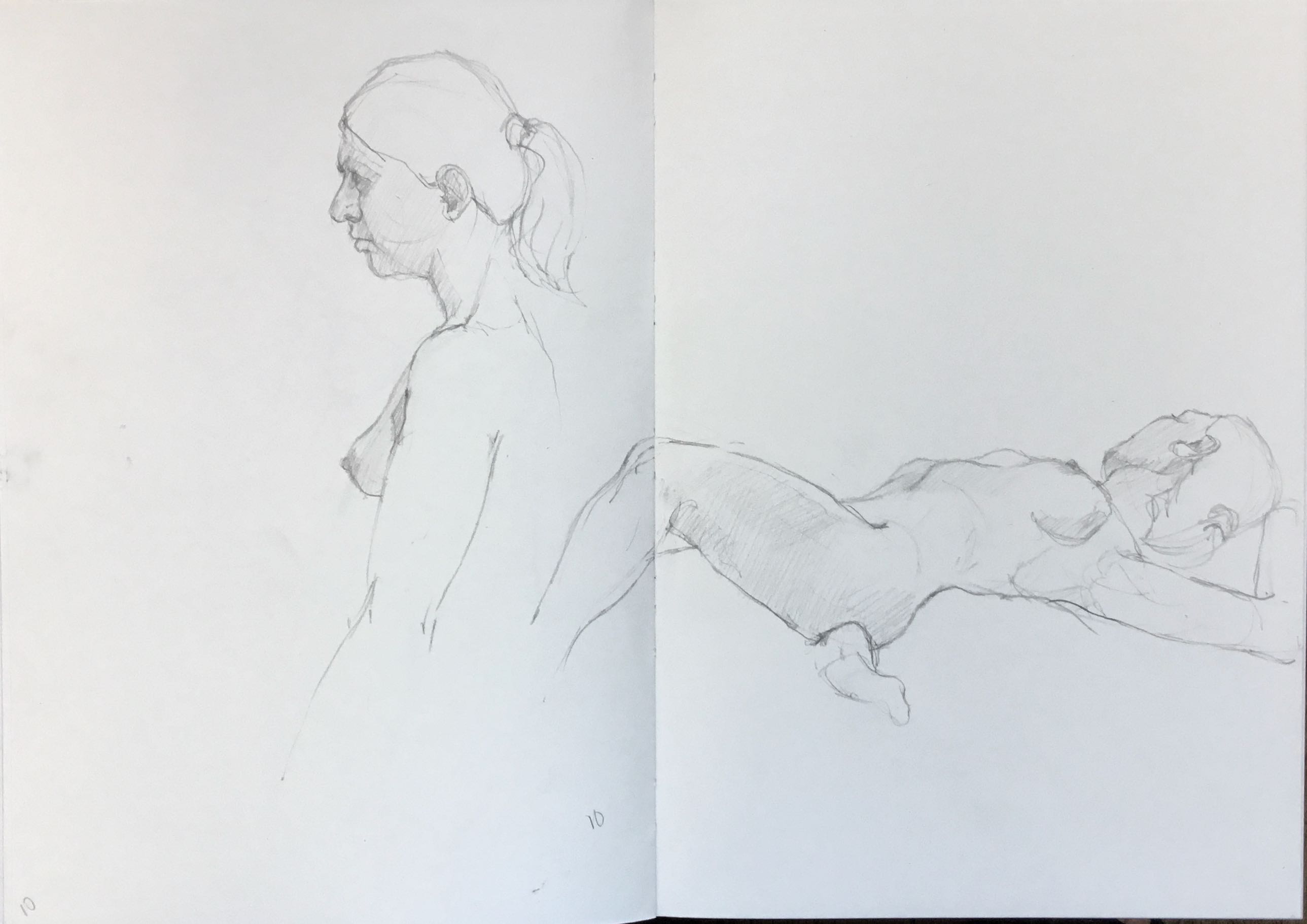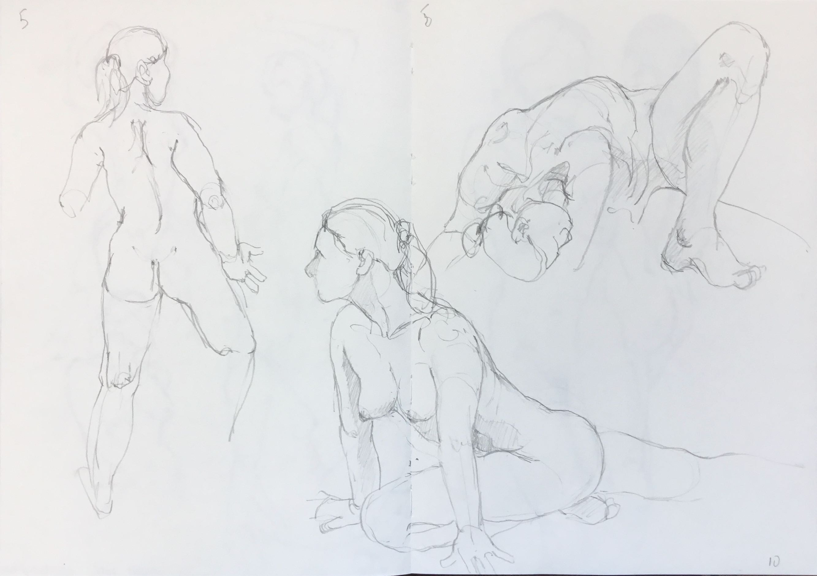 My drawing goes better today and we share our work upstairs in the bar afterwards. I met some lovely people from Australia, Korea, Montreal, England and Italy. The times for each pose are written on the pages.