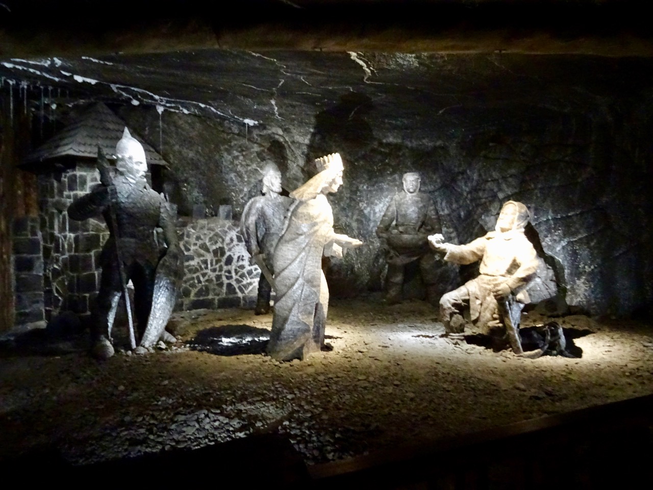 These sculptures are carved out of salt by the miners in the 20th century. These figures illustrate the legend of how the salt mines were discovered in Poland.