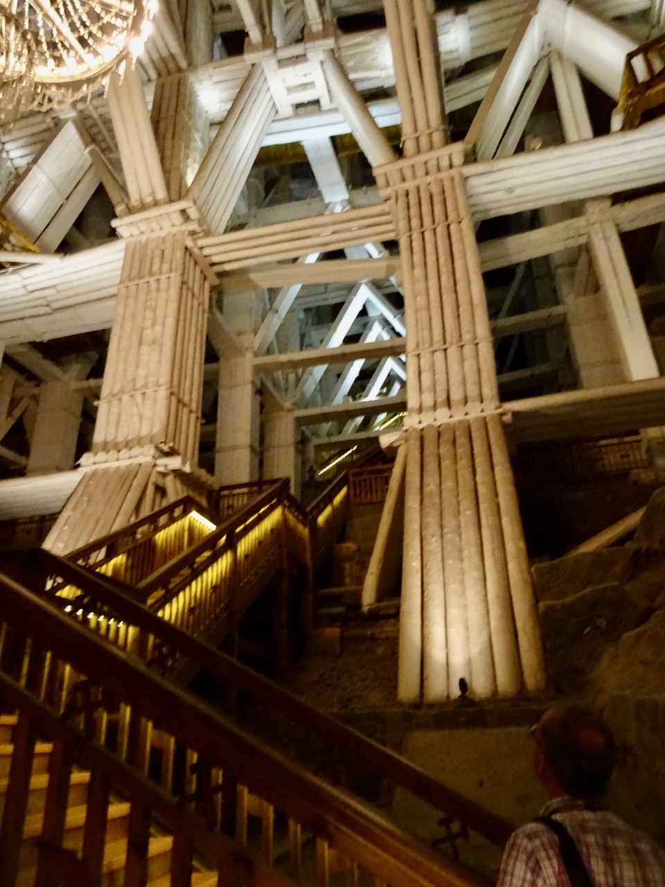 Wow! This is St. Kinga’s Chapel. It is entirely constructed from the salt in the mine. Most of the stairs on our route are made of wood, but these two staircases we walk down are made of salt.