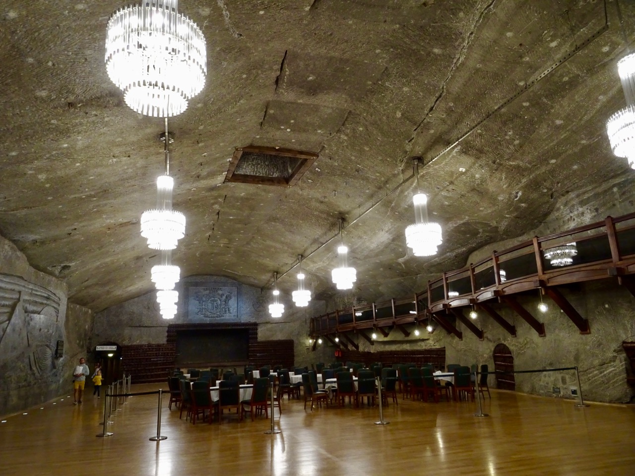 This enormous chamber is 135 meters below ground on the third of nine levels. The entire mine occupies about a 5 km x 5 km area. The ceiling here is 36 meters high and a Guinness World record was set here for an underground hot air balloon flight!