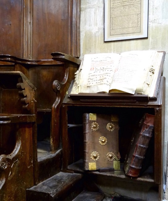 We climb some old stone steps and there is a great view from the second floor behind the altar looking towards the front doors and beautiful stained glass windows.