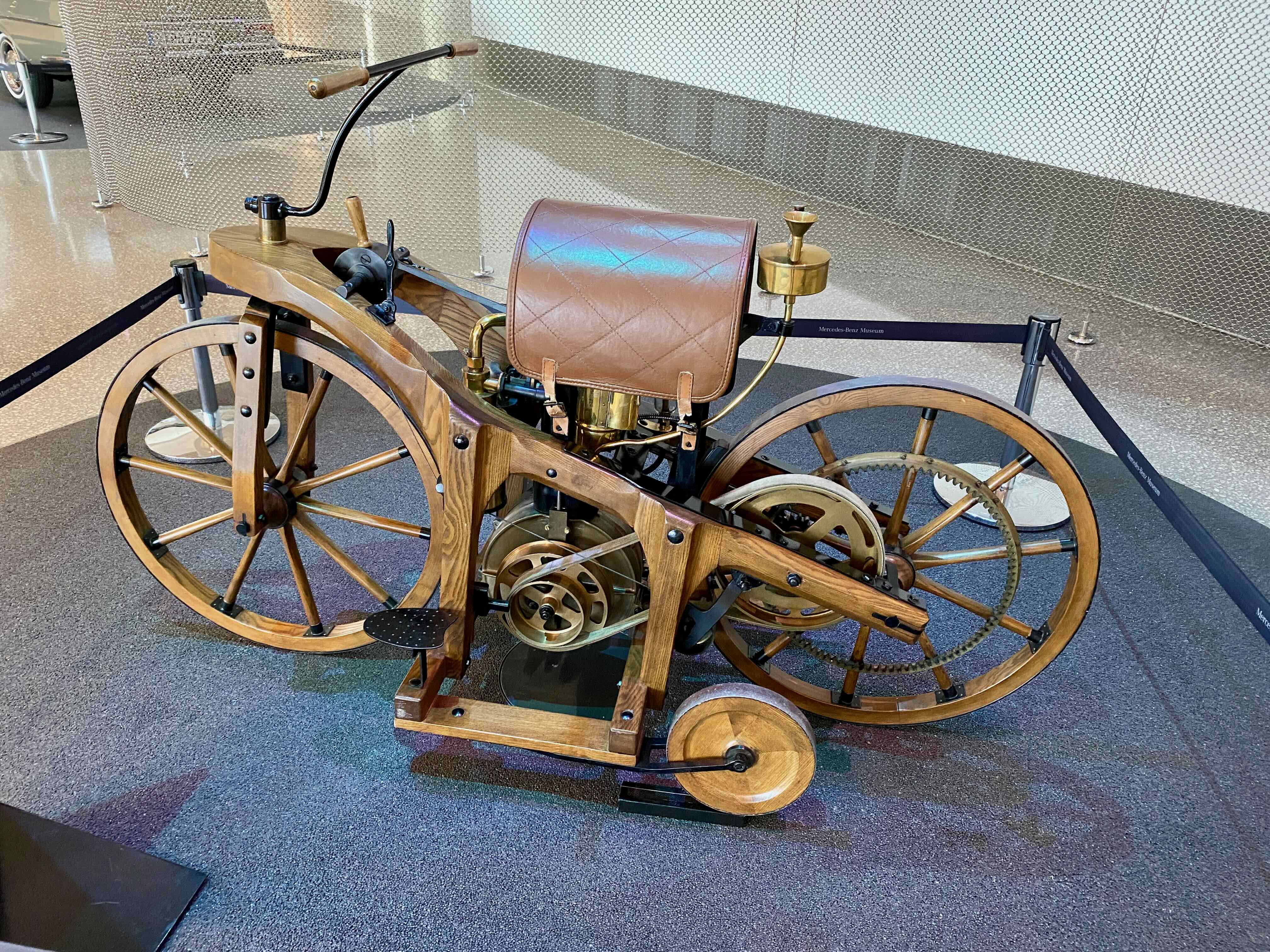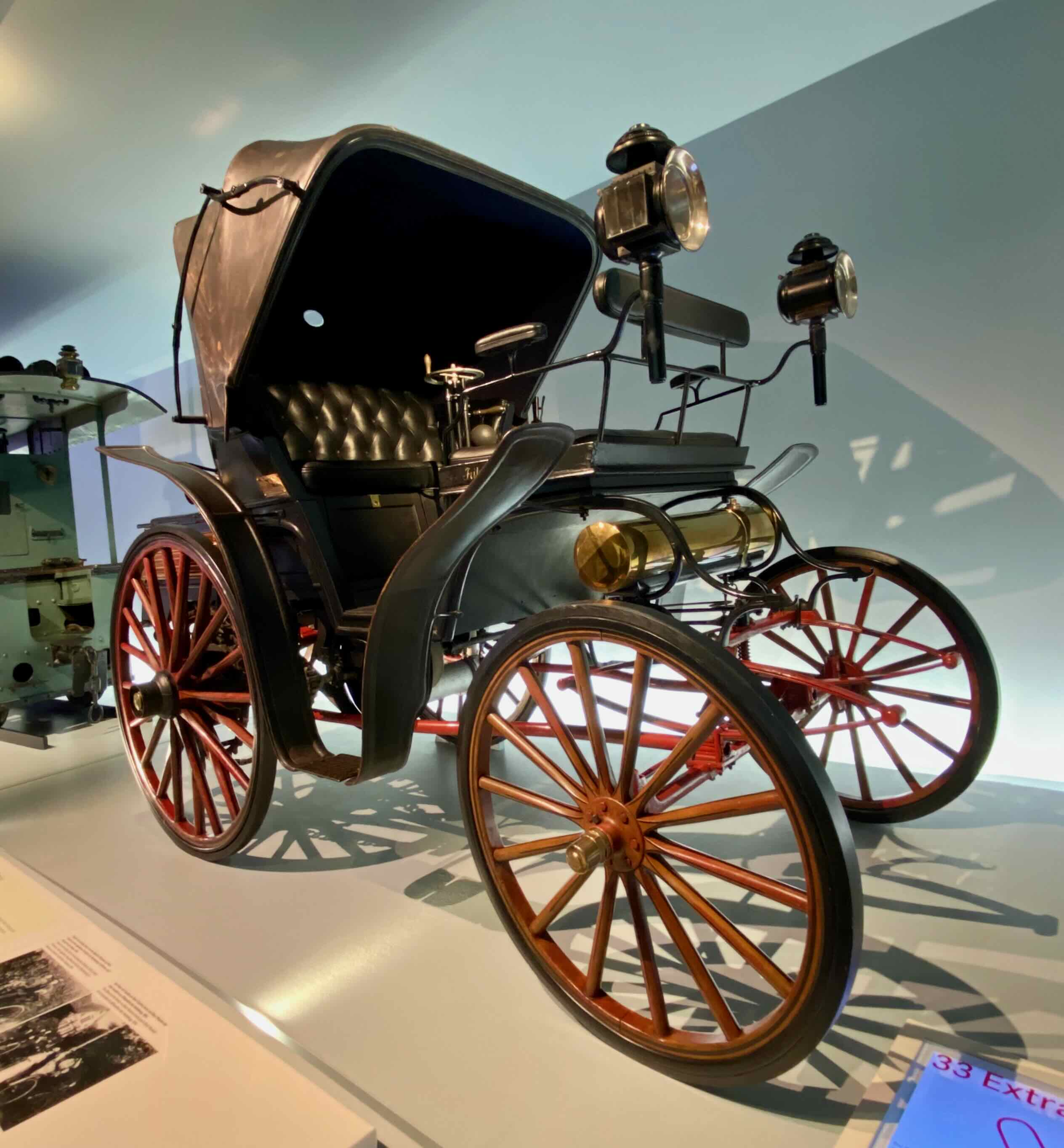 Gottlieb Daimler built this motorized 4-wheeled carriage in 1886. Benz and Daimler built their cars independently but close to Stuttgart. Daimler and his partner Wilhelm Maybach (name of the top of the line Mercedes-Benz) first invented a high-speed gasoline engine to fit this new mode of transportation. The engine was called a “grandfather’s clock” because of its design.