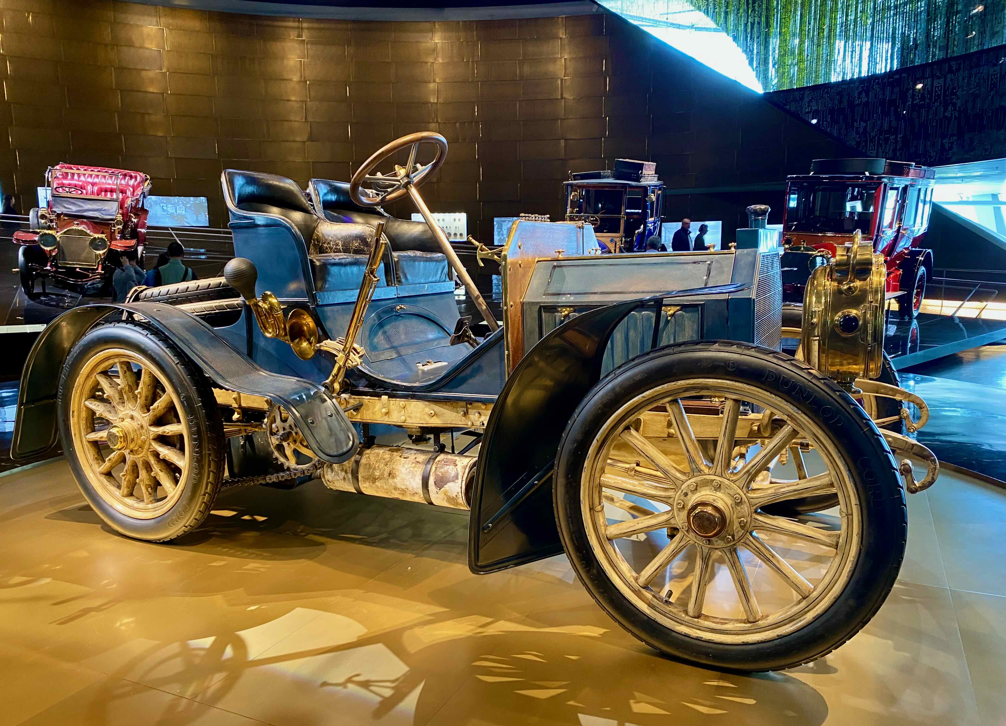A 1902 Mercedes Simplex. This is the oldest Mercedes model still in existence. Notice that the steering wheel is still on the right side. This was so the driver could see the ditch. The steering wheel was later moved to the left side as a bigger concern was the speed of the on-coming traffic.