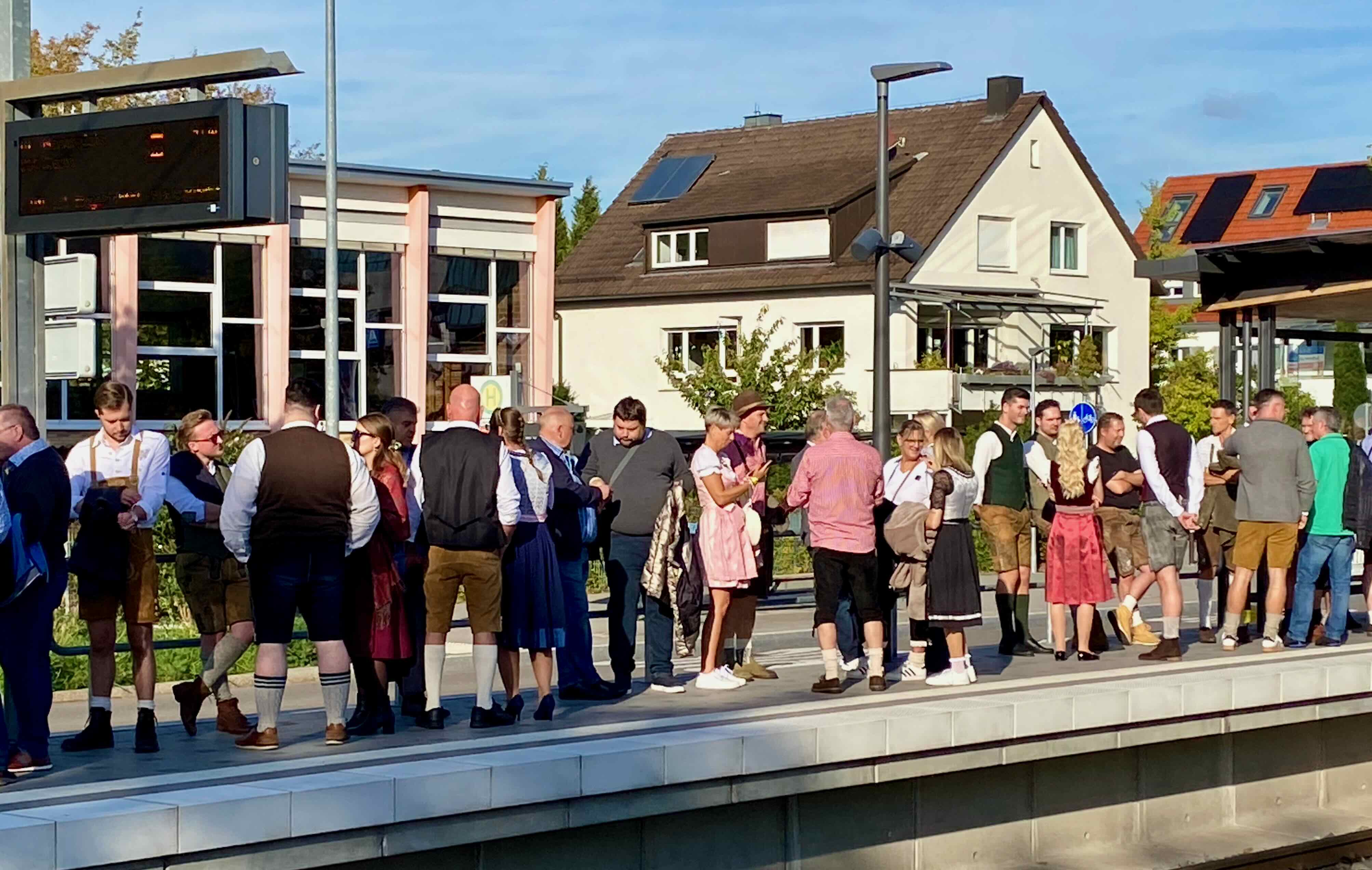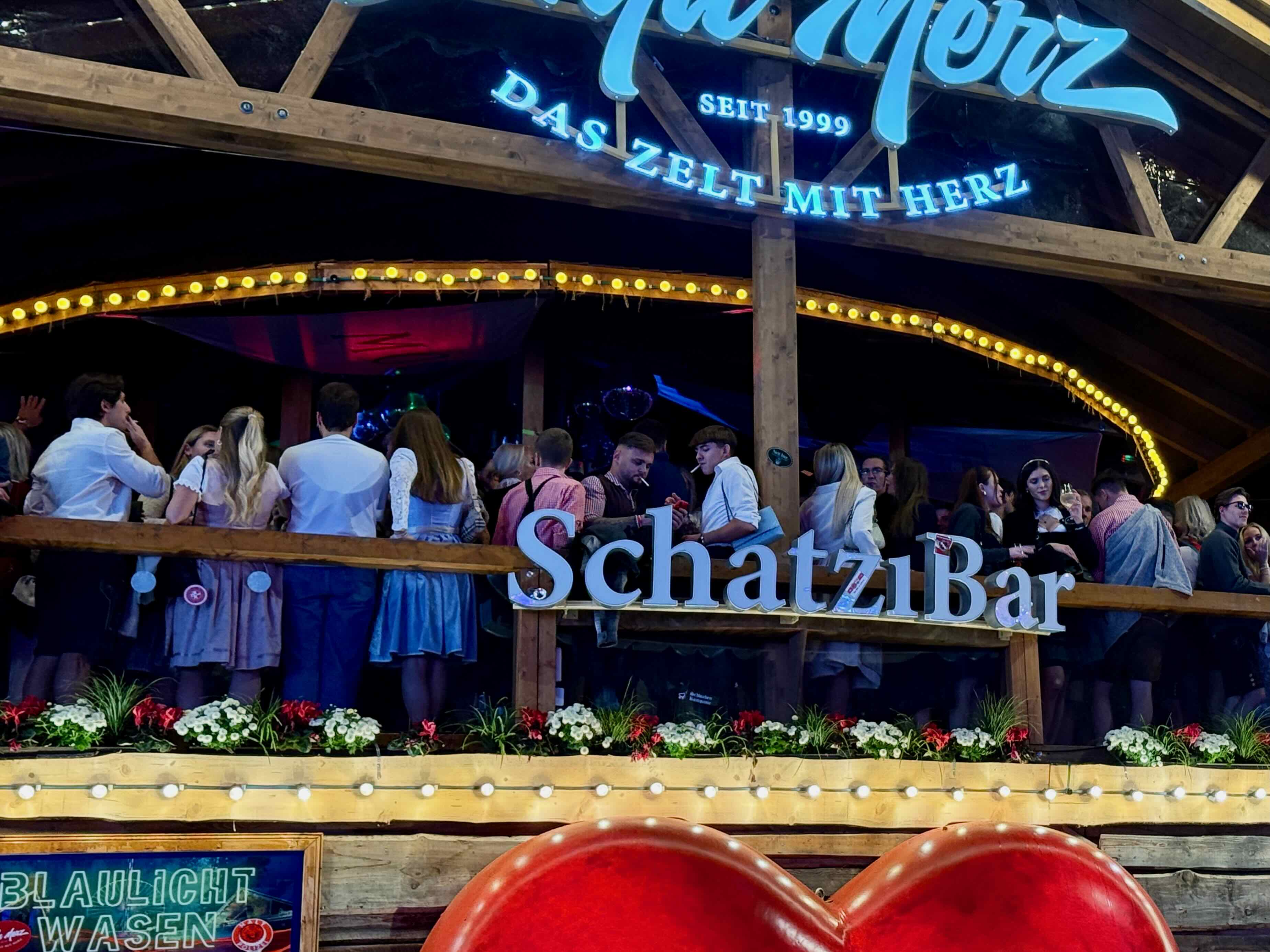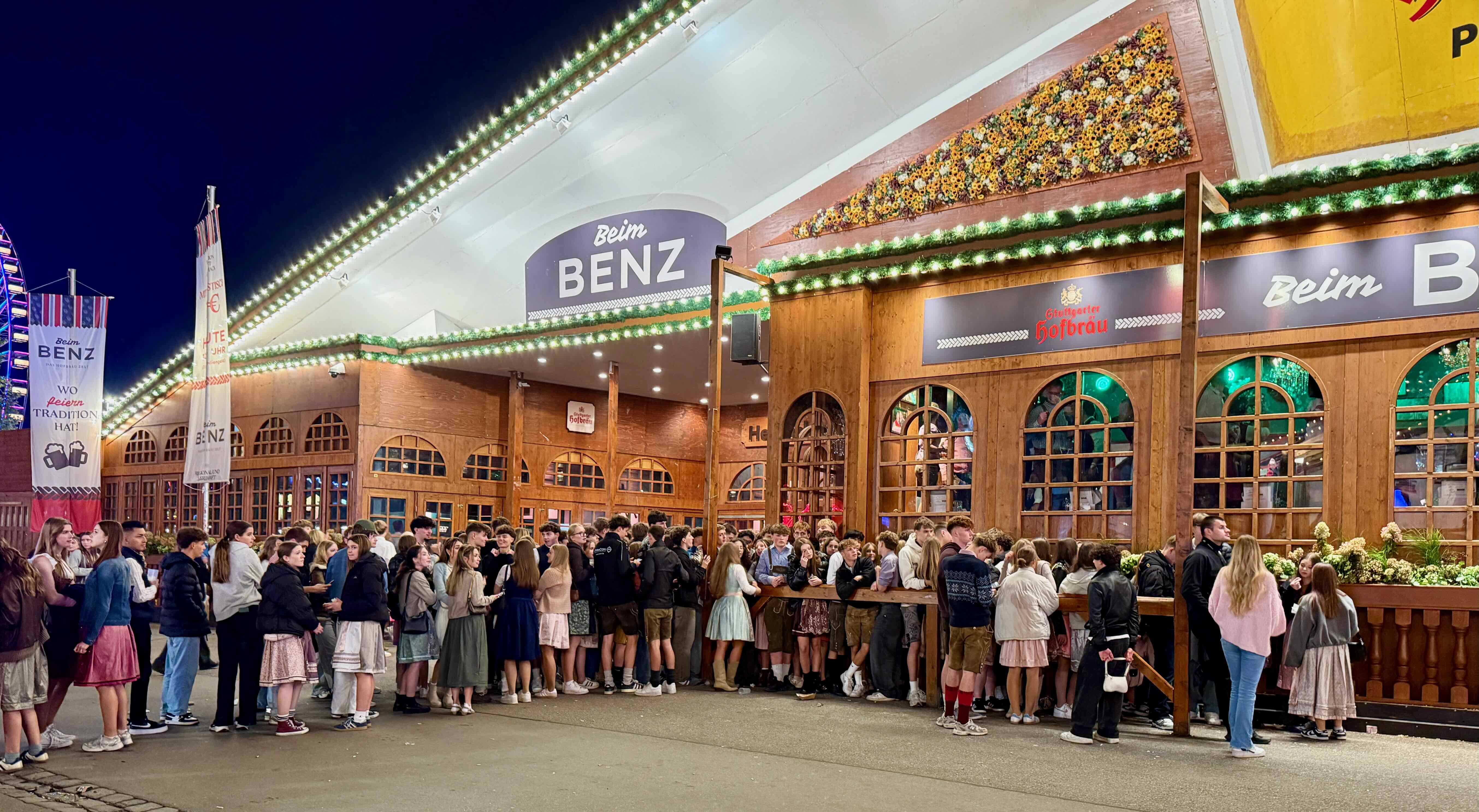 Right beside the entrance, which is free, we see these young men in matching lederhosen drinking beer.
